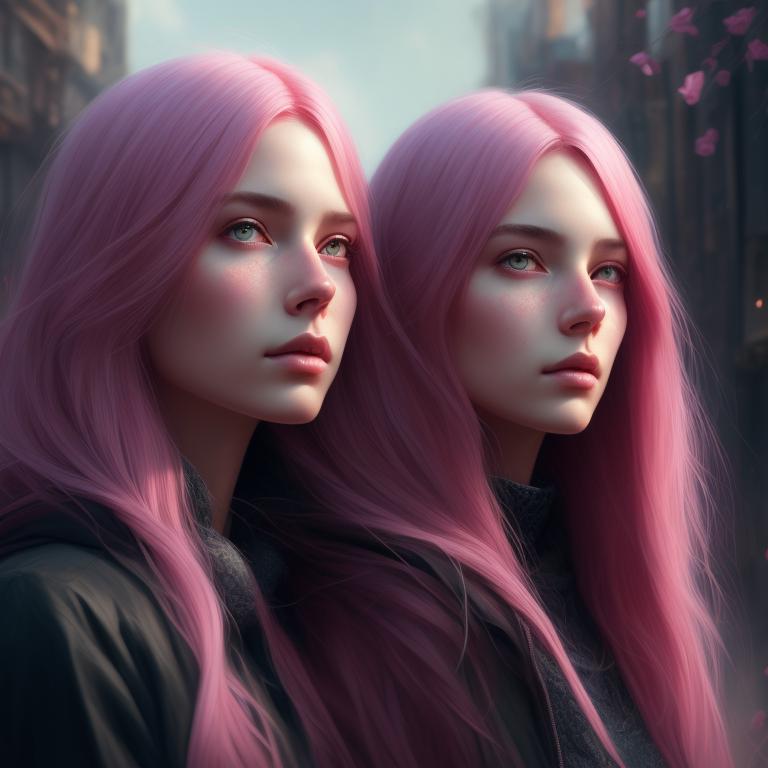 Mysterious pink haired girl, Intricate, Highly detailed, Digital painting, Artstation, trending, by greg rutkowski and mandy jurgens., Daytime, Outside , Two women, Two people, Face is within frame