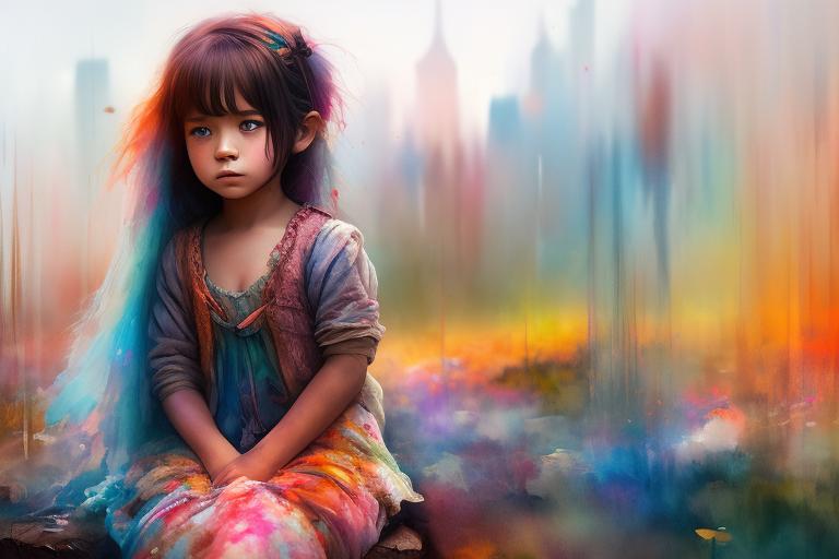 Little Orphan girl in rags. Sad atmosphere. , Highly detailed, Artgerm, Chromostereopsis, Fiverr, Light streaking, Oil painting , VFX, Colors streaking behind, Illustration, Blooming watercolor techniques