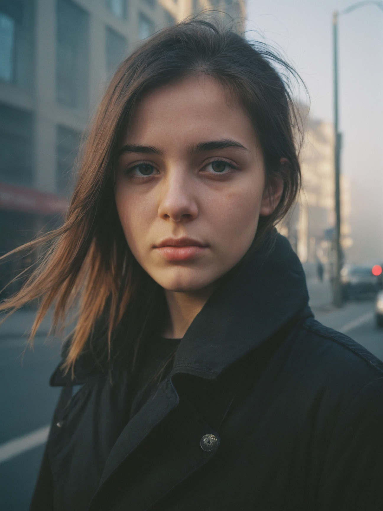 photography, city street, closeup portrait photo of young woman in dark clothes, sunny, daylight, fog, Fujifilm XT3, Canon R5, Fujicolor Fujichrome Velvia 100