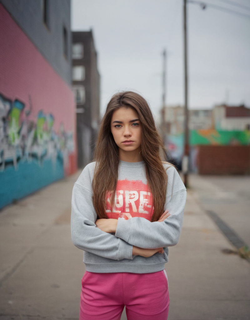 woman, standing, folded arms, city background, casual attire, color-block sweatshirt, pink pants, serious expression, blurred background, urban setting, daytime, street scene, young adult, female, graffiti, overcast sky, long hair, natural makeup, fashion, portrait orientation, soft focus, streetwear., Fujifilm XT3, Canon R5, Fujicolor Fujichrome Velvia 100