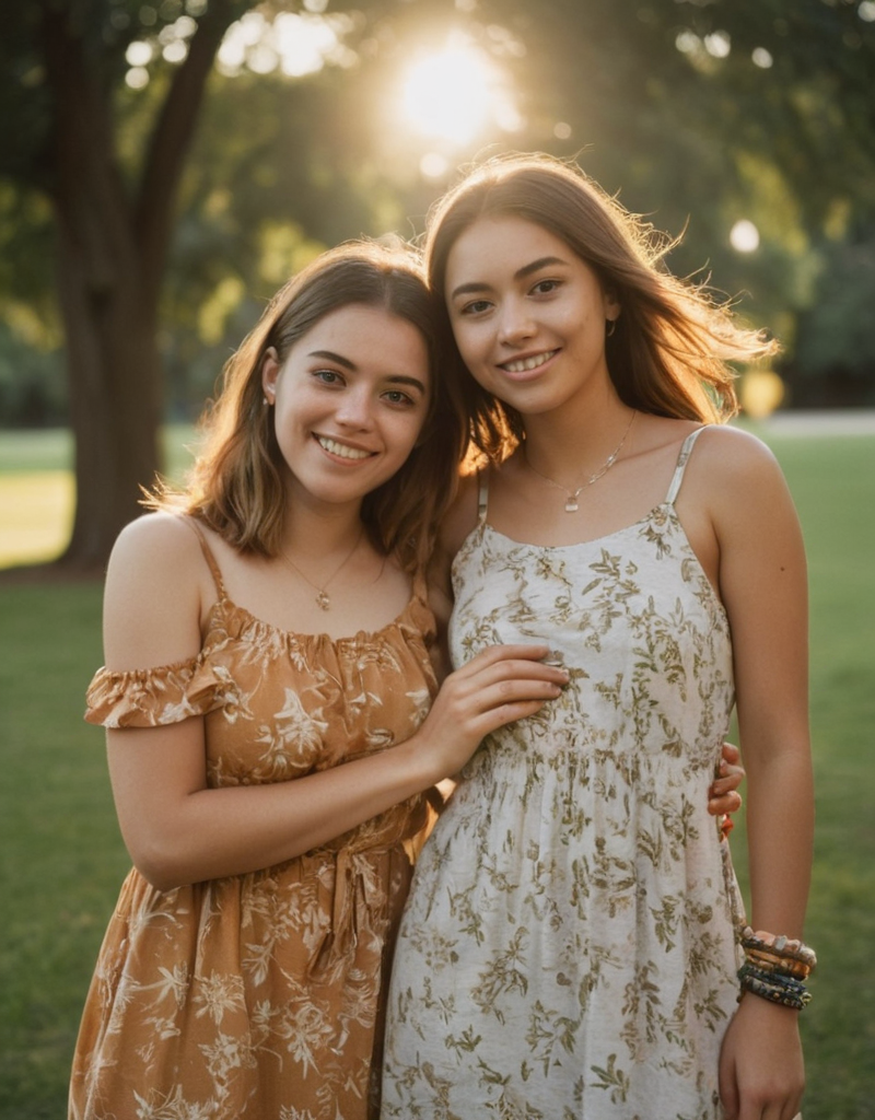 two females, young adults, friends, outdoor, sunset lighting, warm tones, park, embracing, smiling, eye contact, casual fashion, golden hour, natural setting, trees in background, front view, medium-shot, soft focus background, summer attire, joyful expression, partial sunlight, leisure activity, floral dress, bracelets, relaxed pose, Fujifilm XT3, Canon R5, Fujicolor Fujichrome Velvia 100