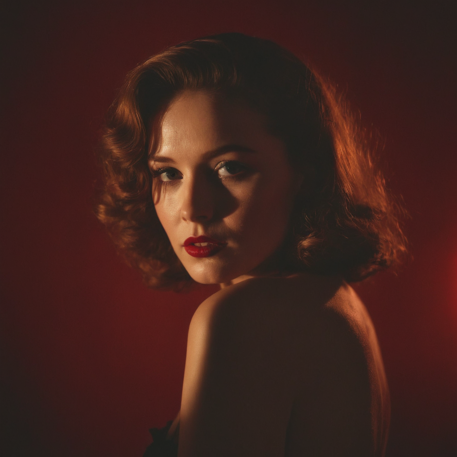 A photo of a (young woman with vintage glamour:1.3),(rich red lighting:1.2),(shadow play on face:1.4),retro hairstyle,(intense gaze:1.3),facing_away,(mystery in her expression:1.2),textured background,film noir,deep contrasts,(sultry atmosphere:1.2),Hasselblad X1D,1/180s,f/2.8,ISO 640,(focused softness:1.1),(elegant attire:1.2),cinematic allure.,
