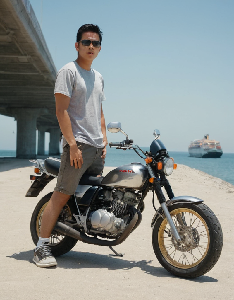 man, motorcycle, beach, Honda bike, casual attire, sunglasses, sunny day, clear sky, sea, sand, adult male, standing pose, motorcycle rider, reflective visor, waterfront, daytime, outdoor, relaxed posture, silver motorcycle, sporty design, leisure activity, fashion sneakers, grey t-shirt, motorcycle exhaust, disc brakes, gold rims, horizontal orientation, lifestyle image, motionless vehicle, engine visible, no helmet, wristwatch., Fujifilm XT3, Canon R5, Fujicolor Fujichrome Velvia 100