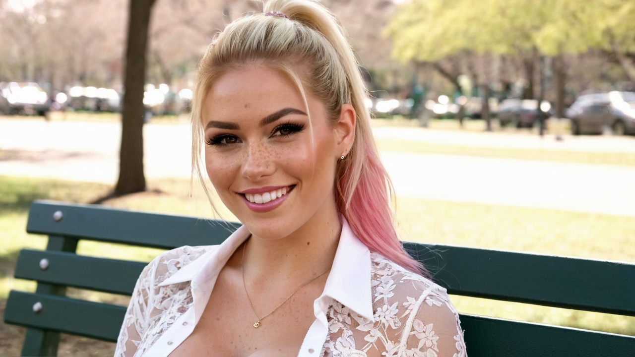hyperdetailed movie still, woman, high detail face, massive tits , freckles, smile, blonde, ponytail, blonde pink hair, transparent white collared long shirt under black lacy bra, neutral colors, strong makeup, blonde pink hair, BREAK jeans, sneakers, sitting and looking at viewer and flirting with viewer on a park bench at on a spring day, hyperdetailed, shot on iPhone 14 photo composition: central subject, soft focus background, Fujifilm XT3, Canon R5, Fujicolor Fujichrome Velvia 100, lace bra, overflowed breast, highly detailed face, remarkable color, ultra realistic, perfecteyes eyes, detailed hair,