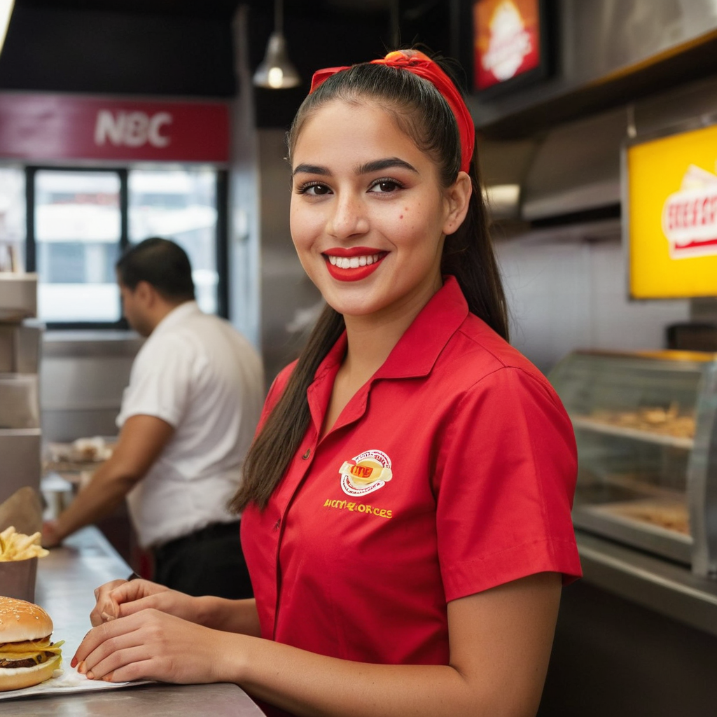 Create an image of a young Latina woman working in a fast food restaurant in New York City. She has warm brown eyes that reflect her friendly and hardworking nature, framed by expressive brows. Her face is heart-shaped, with a sprinkling of freckles across her cheeks that add to her youthful charm. Her lips are full and often painted with a bright red lipstick, adding a pop of color to her appearance. She wears her dark hair pulled back in a ponytail, practical yet stylish for her job. Dressed in a fast food uniform, she wears a bright smile as she serves customers with efficiency and kindness. Capture the essence of this random NYC Latina fast food worker in a portrayal that reflects her warmth, resilience, and vibrant personality, aesthetic, iconic quality, very inspirational, positive, glowing, rich detail, deep colors, cute, magical, mystical, engaging, vivid, dynamic composition, epic, grand elaborate, detailed, creative, ambient light, cinematic, focus, highly professional, original, exposed, enhanced, fabulous background, fine, stunning, illuminated, amazing, marvelous, awesome