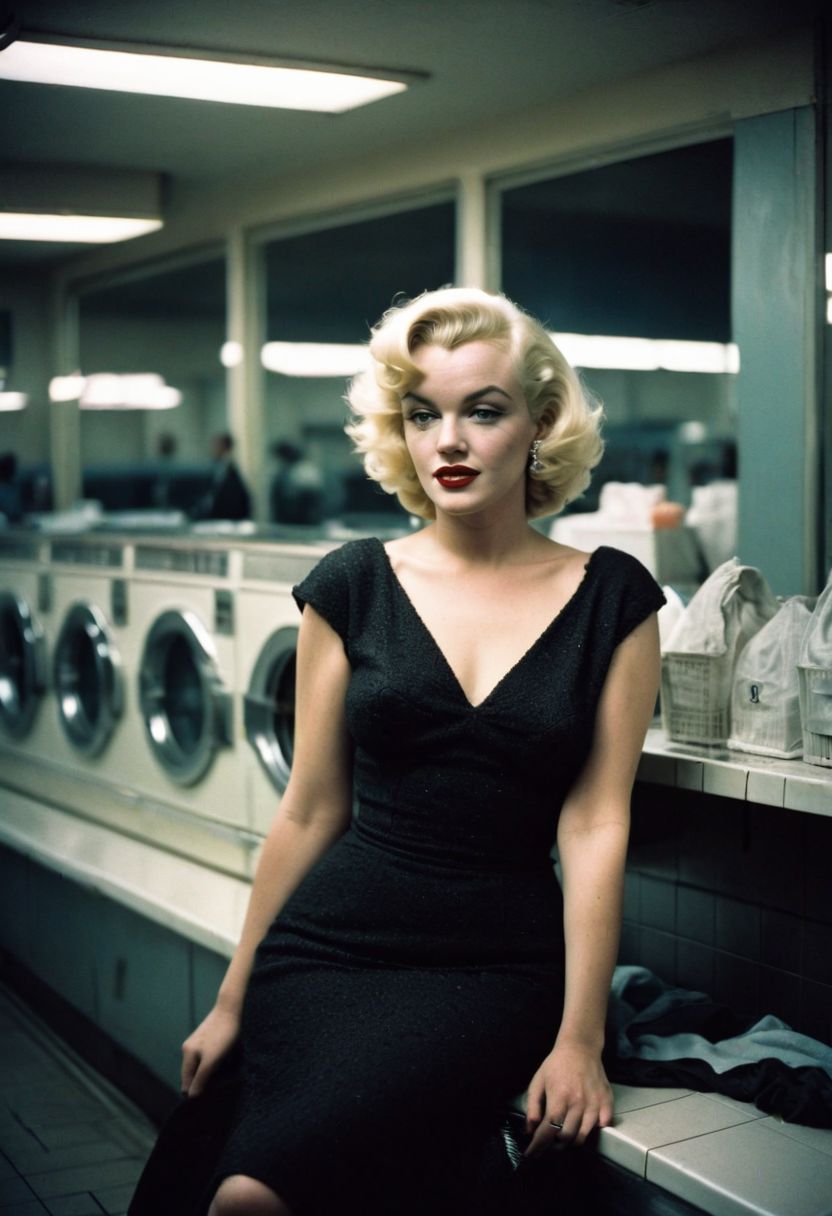 candid snapshot of Marylin Monroe sitting in a laundrette late at night wearing an elegant black Chanel dress, highly detailed face, Perfect Hands, shallow depth of field, vignette, highly detailed, film grain, (cross-processing:0.6), (lomography:0.6)