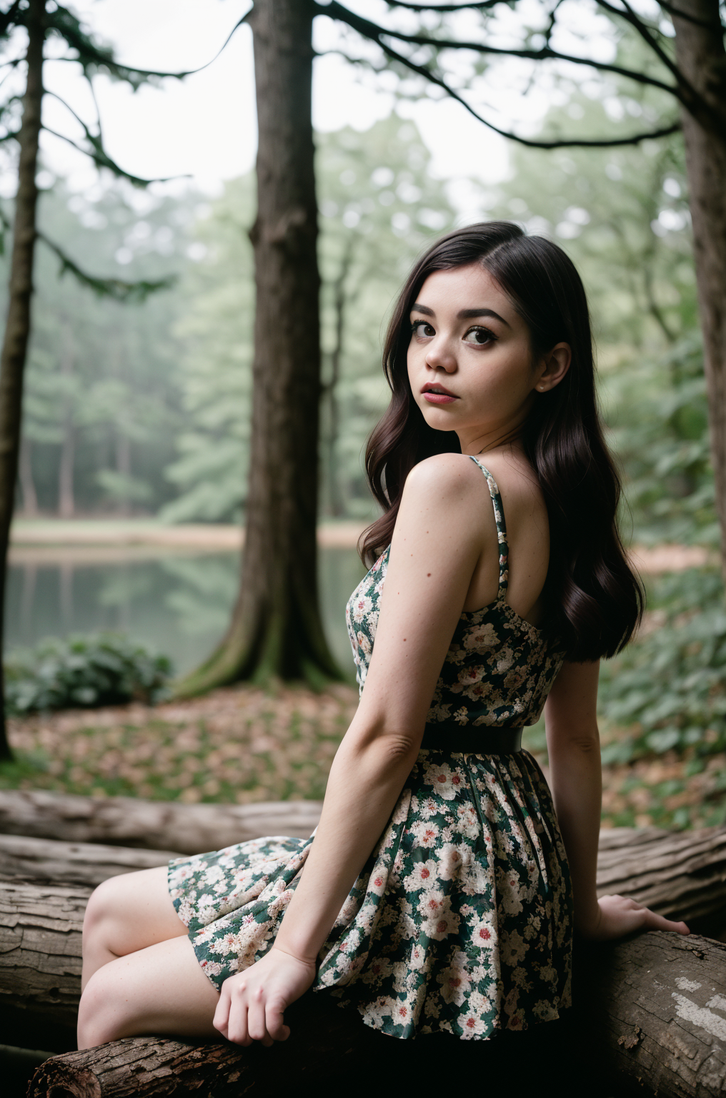 tv_Ebbie_Jones_MXAI_v1, , calm expression, wearing a colorful sundress, sitting on a log at a misty forest pond, golden hour, shot from the side,, (((epic-Ultra-HD-details, epic-Ultra-HD-highlights, epic-photo-same-realistic, upscaled-resolution, optimal))) PA7_Enhancer-02