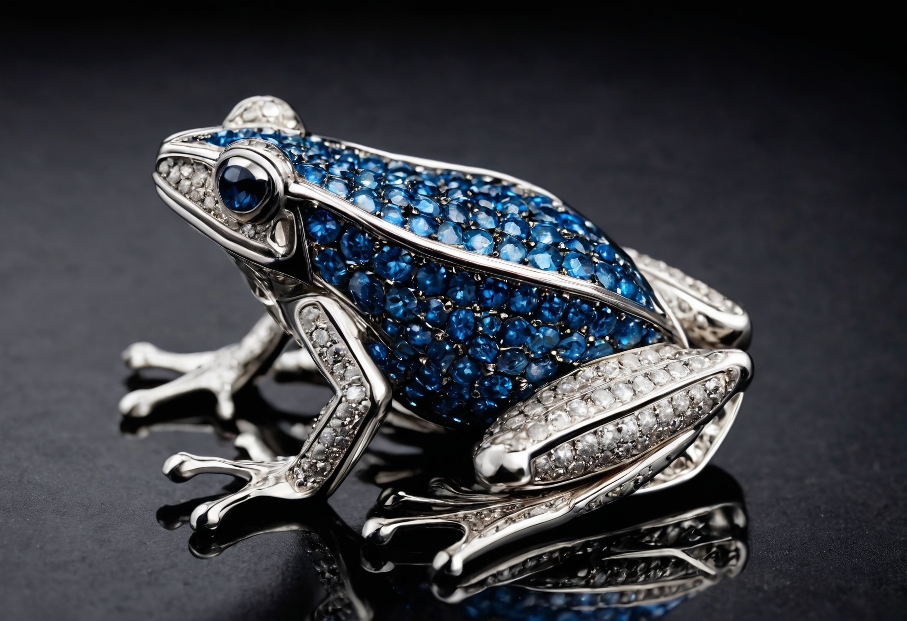 product shot,beautiful jewelry frog brooch,platinum with blue diamonds on it's back,glossy dark background, intrincated, gem, 8k,