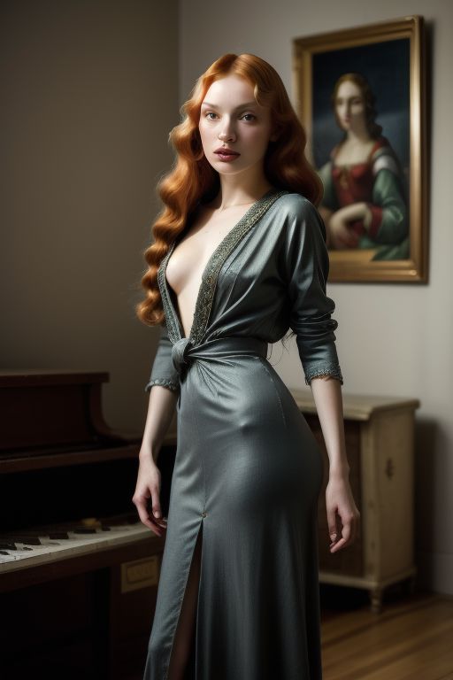 beautiful woman nude, Details++, Photograph of Simonetta Cattaneo Vespucci, Botticelli's model for Venus, 1girl 18yo, woman with long red hair, sandro botticelli style, botticelli, in a style blend of botticelli, aphrodite goddess of love, the birth of venus, botticelli style, in style of sandro botticelli, inspired by Sandro Botticelli, soft pastel, high color contrast, gently faded tones, timeless elegance, highly detailed, master's touch, casual elegance, chiaroscuro lighting, evocative old-world charm. Ektachrome analog film print, Intricately braided hair, fully clothed, (modern clothing:1.4), standing, provocative posture, (formal attire:1.4), elegant indoors, Details++