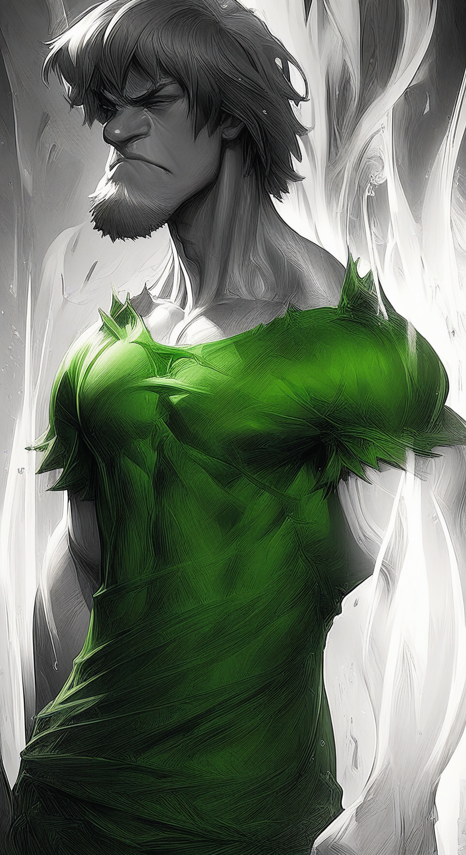 score_9, score_8_up, score_7_up,solo, 1boy, male focus,face focus,detailed face, brown hair, shirt,white flame aura,epic,huge muscle arms,monochrome,green shirt,buffed,grumpy face,10% power level,, <lora:add-detail-xl:0.8> <lora:Shaggy_Rogers3:1>,