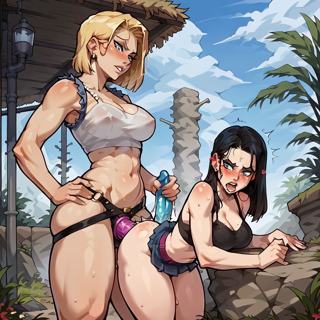 Score_9,score_8,android 18 wearing strap-on dildo, bottomless, thick thighs, hands on hips, badass