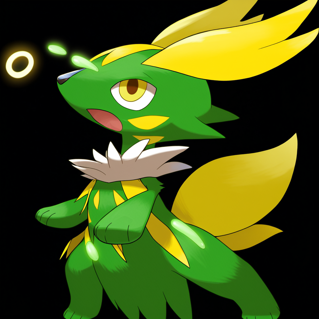 <lora:pokemon_pony_xl:0.7>, Type: Grass, Type: Steel Egg Group: Amorphous The animal's fur has a Gray undertone that shimmers in the moonlight, making it a sight to behold during nocturnal activities,Eyes that glow faintly in the dark, revealing hidden depths of wisdom and untold secrets,The monster's touch can heal, mending wounds and soothing pain with a mere caress,The monster's underbelly glows with a soft Bronze light, visible only during the night, guiding its path in the darkness,It has a Yellow tuft at the end of its tail that releases a soothing scent calming those around it,It has a Yellow ribbon-like appendage that it twirls to communicate or during its intricate mating dance,It has a Green aura that envelops it during battles intensifying its Normal abilities,Its hide is patterned with Indigo swirls that shift slowly, mesmerizing anyone who gazes upon them.,It has a Yellow tuft at the end of its tail that it uses to spread its scent and mark its territory.,The creature's footfalls cause the earth to hum with a Yellow melody harmonizing with the natural world, score_9, score_8_up, score_7_up, score_6_up, score_5_up, score_4_up. Simple black background, (Masterpiece:1.3) (best quality:1.2) (high quality:1.1)
