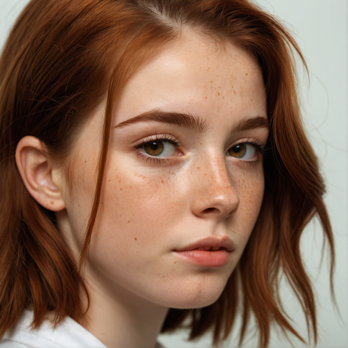 analog photography, 1girl, 25yo, Scottish, auburn hair, hazel eyes, freckles, fit, medium close-up shot, profile shot, pensive expression, neutral uniform photostudio background,, 8k resolution, highres, high detail, sharp focus, detailed skin, 8k uhd,