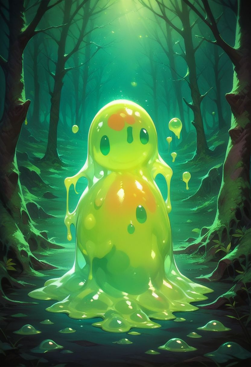 (slime:1.3), score_9, score_8_up, score_7_up, rating_safe, realistic, intricate detail, Cthulhu, green skin, bioluminescence, (slime \(substance\):1.3), acidzlime <lora:acidzlime:1>, smoke, bubbles, covered in a splashes of green acid, acid water, liquid acid, dark forest, night, volumetric lighting