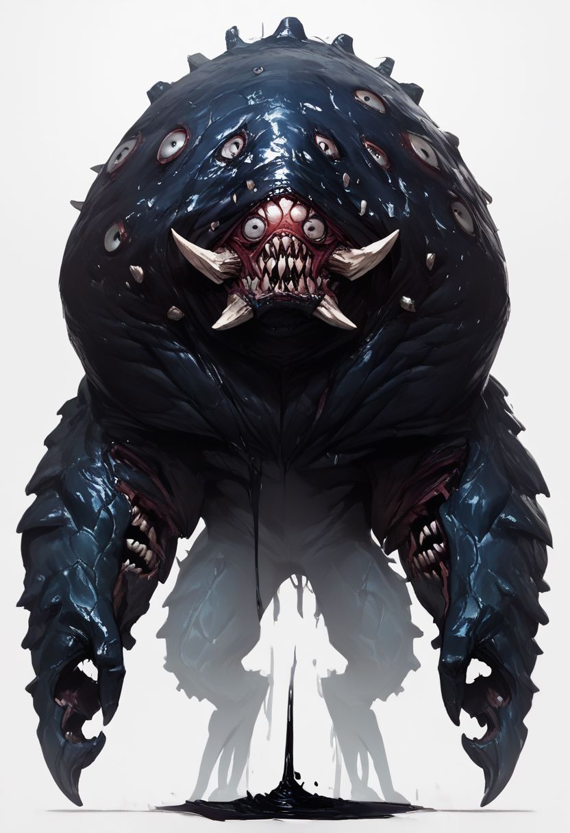 score_9, score_8_up, source_anime, creature made of black oil, shiny, wild, huge eyes, jagged teeth, white background
