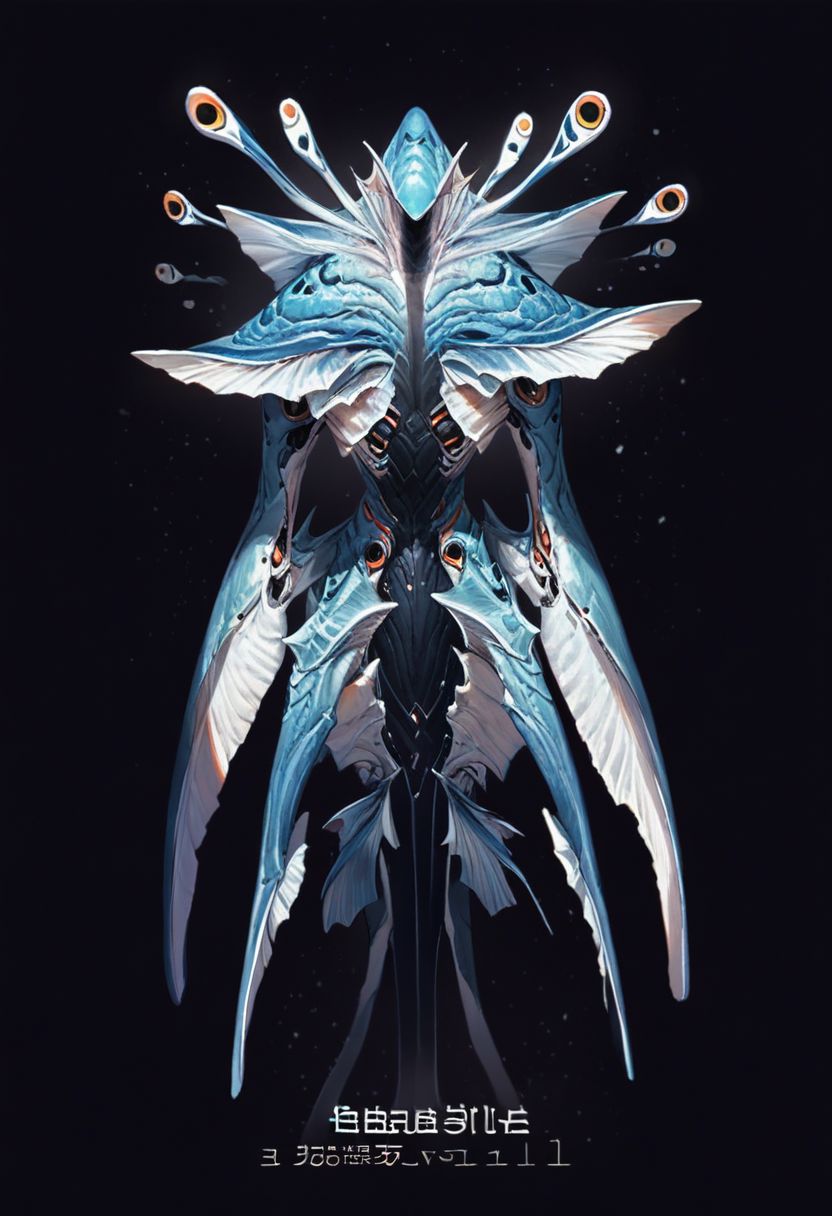 score_9, score_8_up, source_anime, rating_safe, anthropomorphic, unusual creature, fish, concept art, creature, beautiful alien, anthropomorphic, blue and white silhouette on a pure black background, a full-length character of an alien fictional race, the body shape consists of many fins, scales, futuristic style