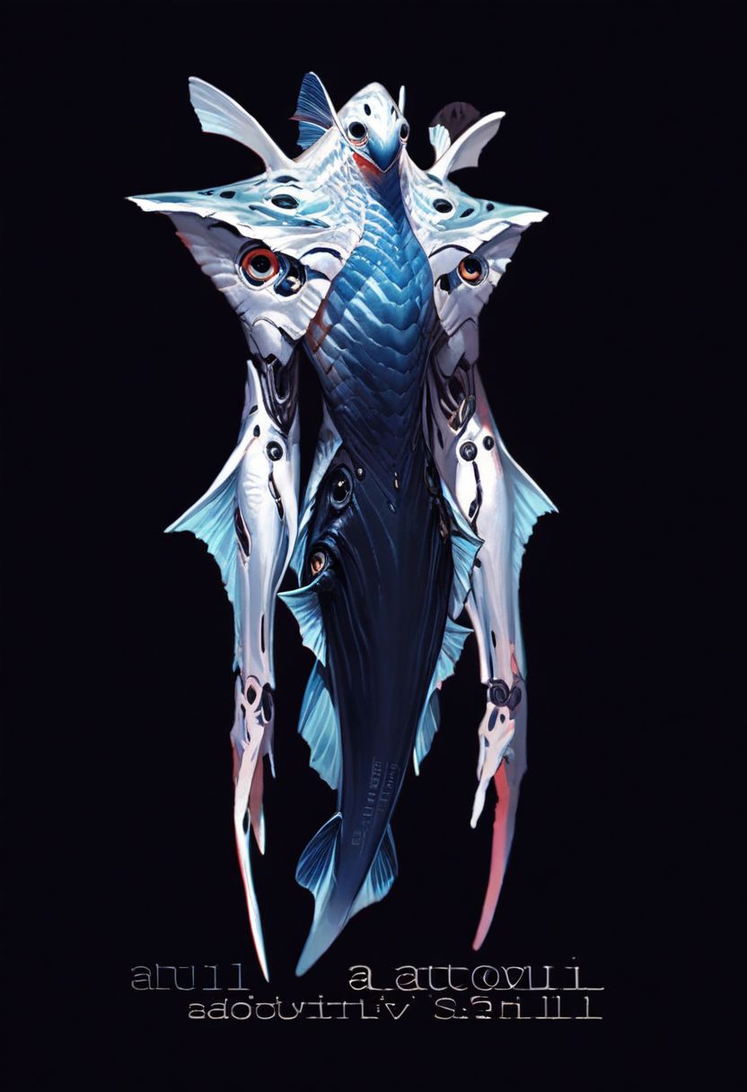 score_9, score_8_up, source_anime, rating_safe, anthropomorphic, unusual creature, fish, concept art, creature, beautiful alien, anthropomorphic, blue and white silhouette on a pure black background, a full-length character of an alien fictional race, the body shape consists of many fins, scales, futuristic style