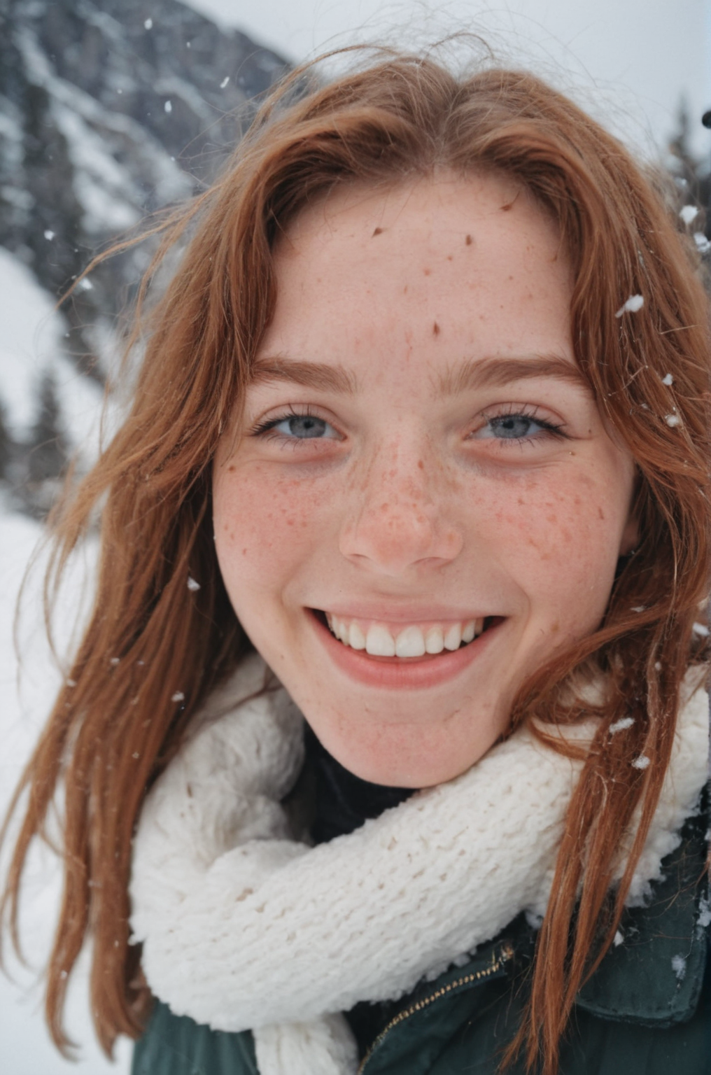 35mm photography portrait of beautiful smiling woman with freckles in a snow-covered mountain <lora:epiCPhotoXL:1>