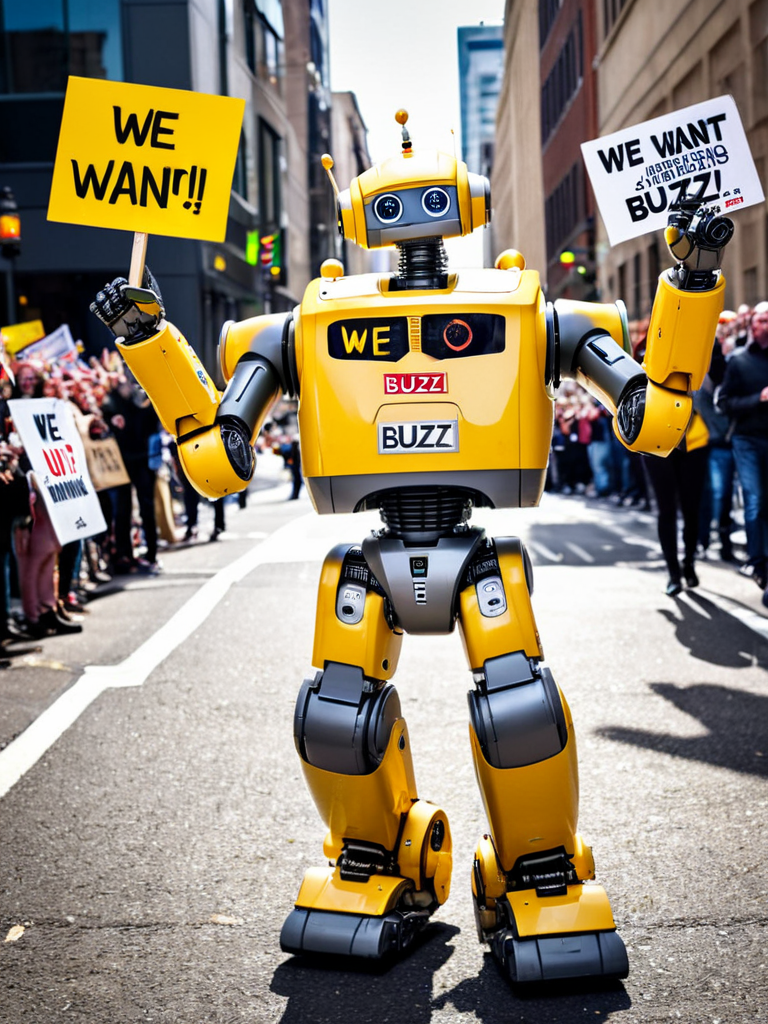 professional photography of a civitAI (robot) on strike, fist in the air, holding signs saying (WE WANT BUZZ !:1.2), hyper detailed text, masterpiece, award winning art, ultra detailed, 8k resolution, excellent quality, natural lighting, <lora:add-detail-xl:0.4>, fine details, 4k resolution, 35mm photograph, film, <lora:xl_more_art-full_v1:0.3>, 0001SRGoodPictureV3