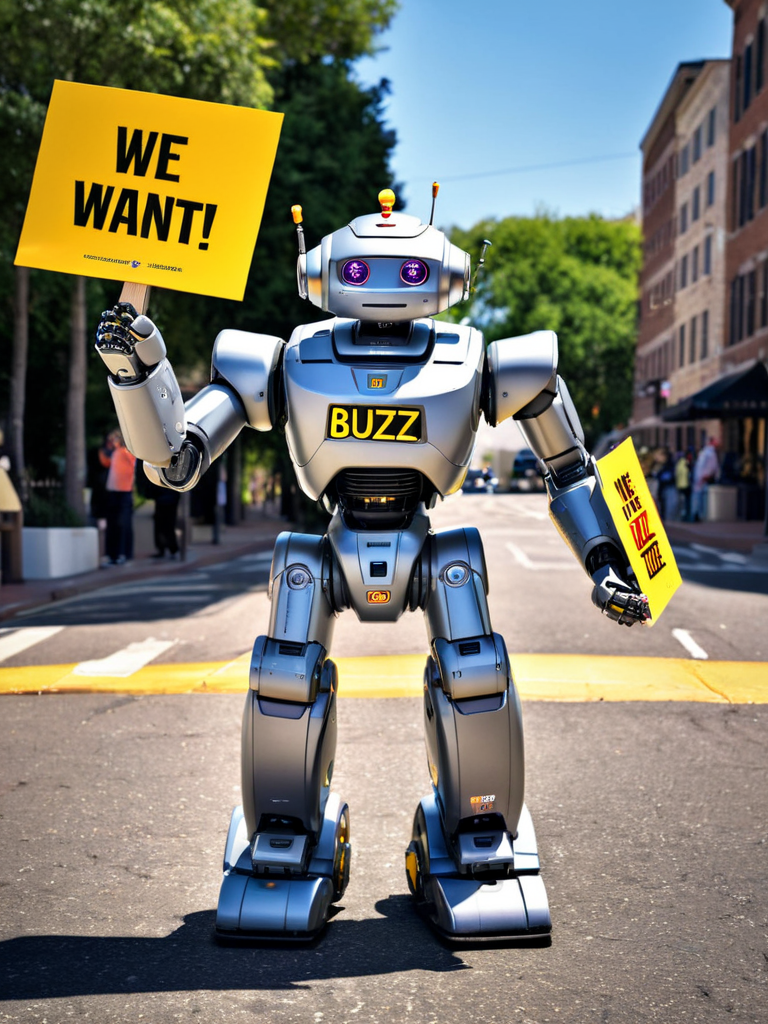 professional photography of a civitAI (robot) on strike, fist in the air, holding signs saying (WE WANT BUZZ !:1.2), hyper detailed text, masterpiece, award winning art, ultra detailed, 8k resolution, excellent quality, natural lighting, <lora:add-detail-xl:0.4>, fine details, 4k resolution, 35mm photograph, film, <lora:xl_more_art-full_v1:0.3>, 0001SRGoodPictureV3