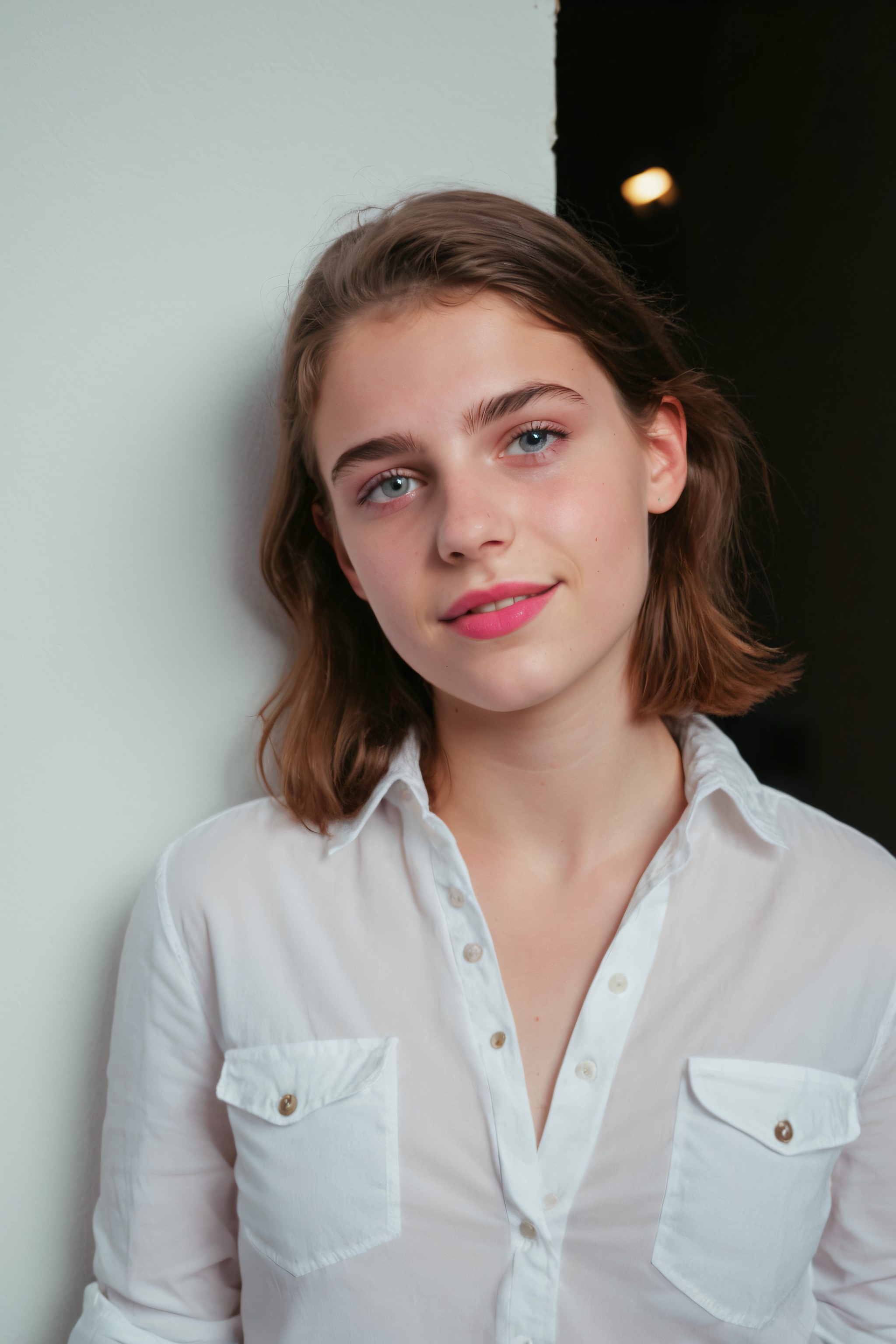 half-body, cinematic photography of French girl, 20yo, portrait, f2, noise, brunette, jpeg artefacts, bright lighting ,makeup on eyes and face, pink lipstick, looking at viewer, little smile, ((white unbuttoned shirt:1.4)), <lora:epiNoiseoffset_v2:1>