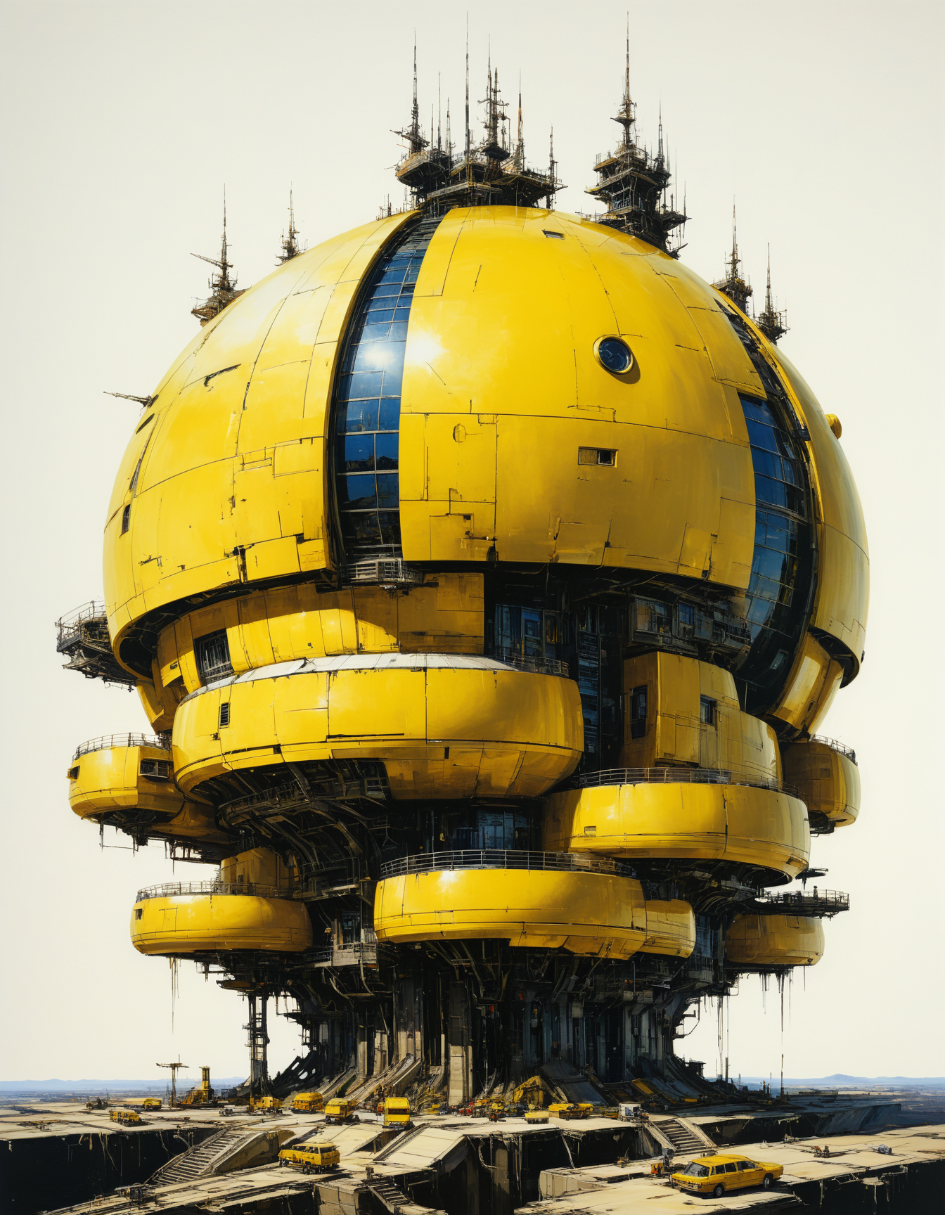 hyper realistic photograph of a (complex architectural science fiction structure:1.4) by Bob Eggleton and Yoji Shinkawa, (glossy , yellow , masterful:1.4), medium full shot, poster art, bold lines, hyper detailed, expressive, award winning, dark limited color palette, high contrast, depth of field, (intricate details, masterpiece, best quality:1.4), overexposure, looking at viewer, dynamic pose, wide angle view, <lora:add-detail-xl:1> <lora:xl_more_art-full_v1:0.5> <lora:NicolaSamori:0.5> in the style of nicola samori <lora:looking_at_viewer:2>