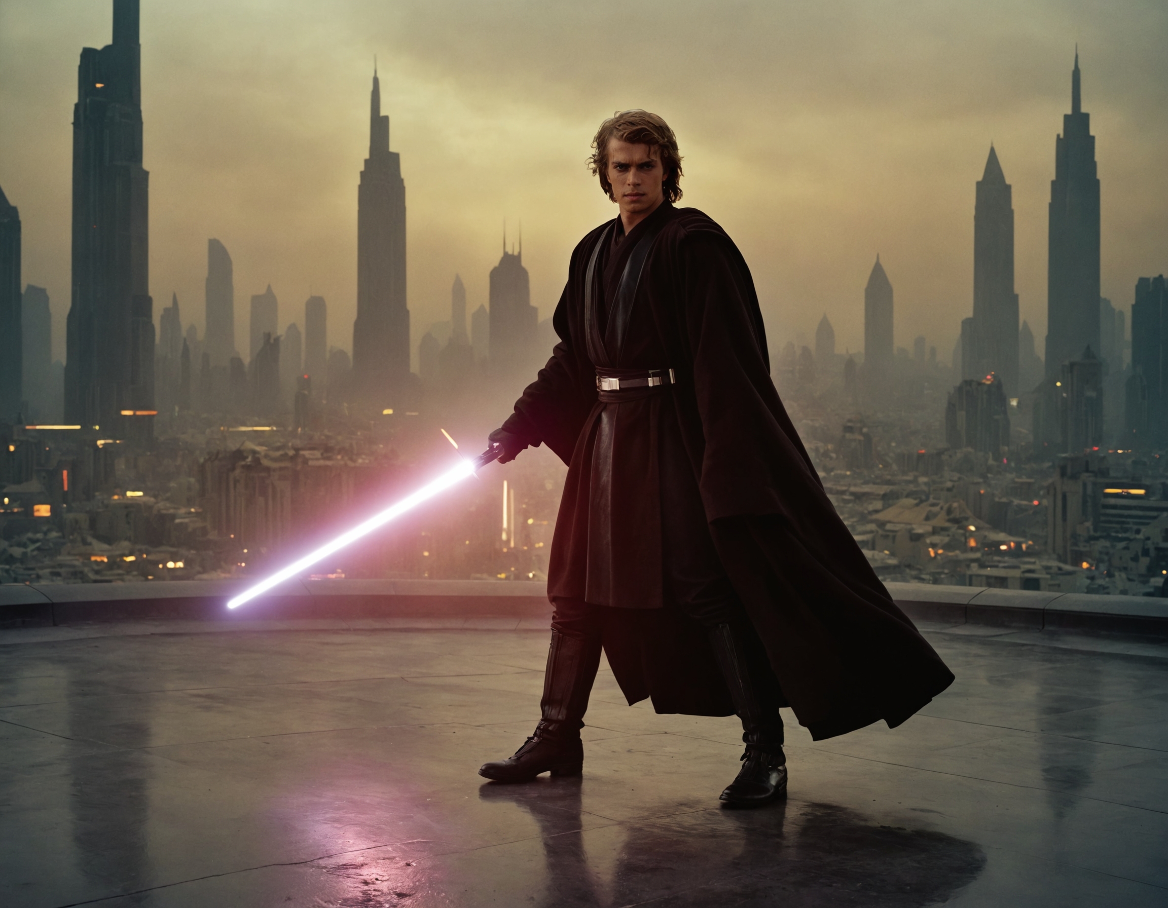 stunning award winning photo of anakin man,holding a lightsaber,j3di outfit,j3di robe,full body shot,coruscant city background,film grain,volumetric fog,anamorphic,distorted lens,chromatic aberration,volumetric lighting,cinematic,epic composition
