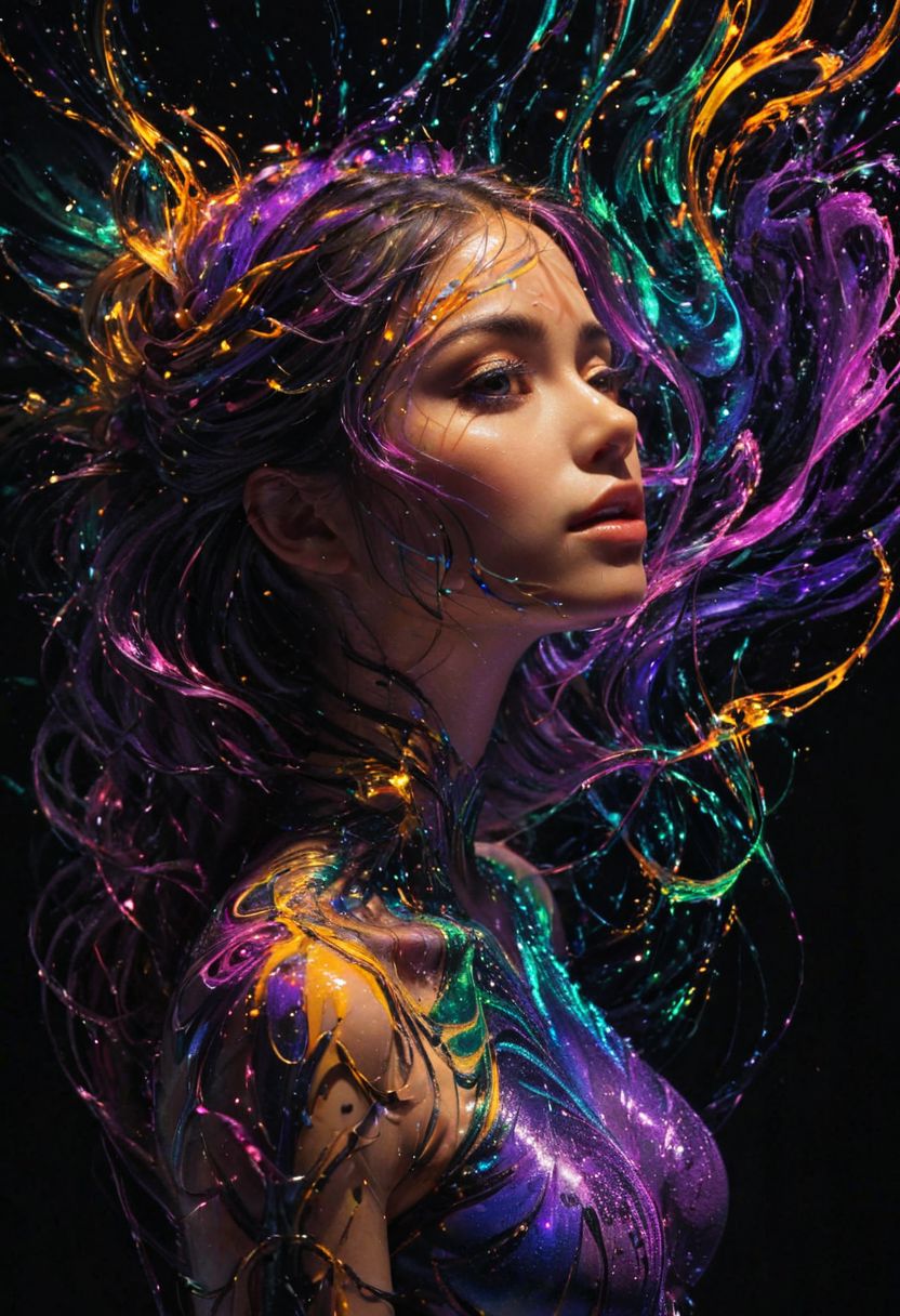 colorful, ColorART, Movie Still, Film Still, Cinematic, Cinematic Shot, Cinematic Lighting, JuggernautNegative, This stunning image depicts a female figure surrounded by vibrant, swirling strands of light in various colors. The strands seem to emanate from and envelop the subject, creating a mesmerizing and abstract effect. The colors range from warm tones like red, orange, and yellow to cooler hues like blue, green, and purple, creating a visually striking contrast. The strands appear to have a luminous, neon-like quality, giving the image a futuristic and otherworldly vibe. The female figure is portrayed in a side profile view, her face partially obscured by the swirling strands. Her facial features are visible, but the emphasis is on the interplay between her form and the dynamic, colorful strands that surround and intertwine with her. The background is a deep, solid black, allowing the vibrant colors and intricate patterns of the light strands to take center stage. The overall composition creates a sense of motion, energy, and a dreamlike quality, inviting the viewer to interpret the image's symbolism and meaning. This image could be seen as a representation of the complexities of human emotion, thought, or creativity, with the figure serving as a vessel for the ever-changing and interconnected streams of energy that shape our experiences. .