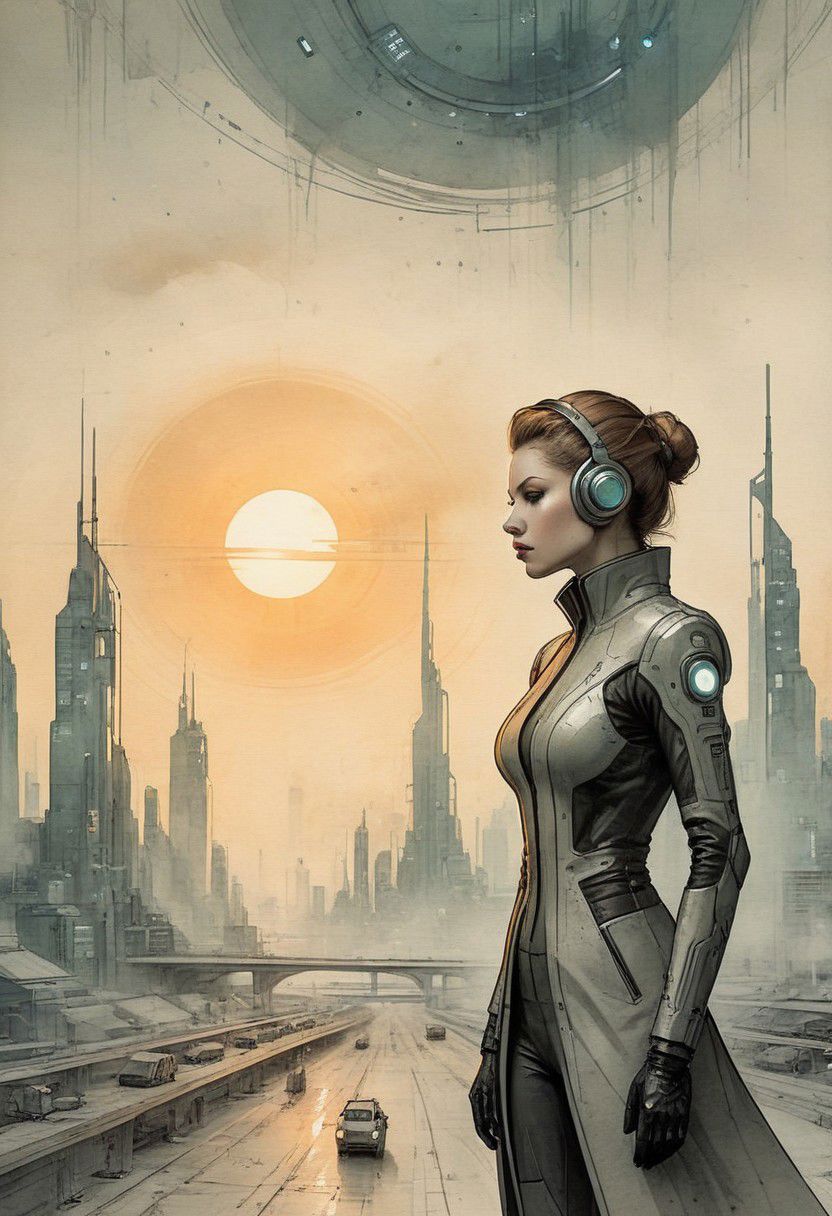 old book style ink illustration, on parchment, ink splashes, ink stains, ink smears, faded ink, (female enforcer:1.2), (futuristic:1.5) city of steel, glass, fog, sun, in the clouds, skyscrapers, futuristic transit, fractals, sunrise, moody tones, mentixis, linquivera