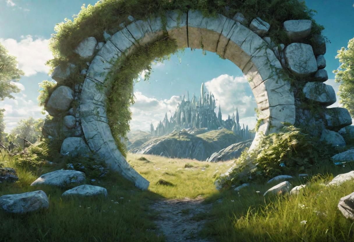 Hyperrealistic art fantasy temperate grassy meadow landscape, a glowing Runes covered (white stone) (magical:1.2) Circular gate (portal:1.3), a detailed matte painting by Mike Winkelmann, cgsociety, fantasy art, blue sky, Extremely high-resolution details, photographic, realism pushed to extreme, fine texture, incredibly lifelike