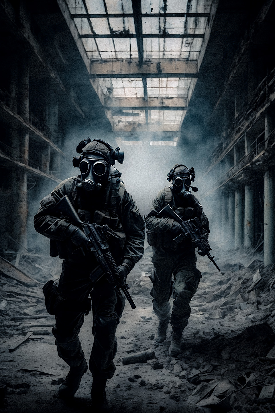 A group of special forces soldiers in gas masks exploring a derelict nuclear power plant, aiming assault rifles, toxic gas, unstable structures, radiation, reactor, cinematic, realistic, atmospheric, tense, dark, shadows