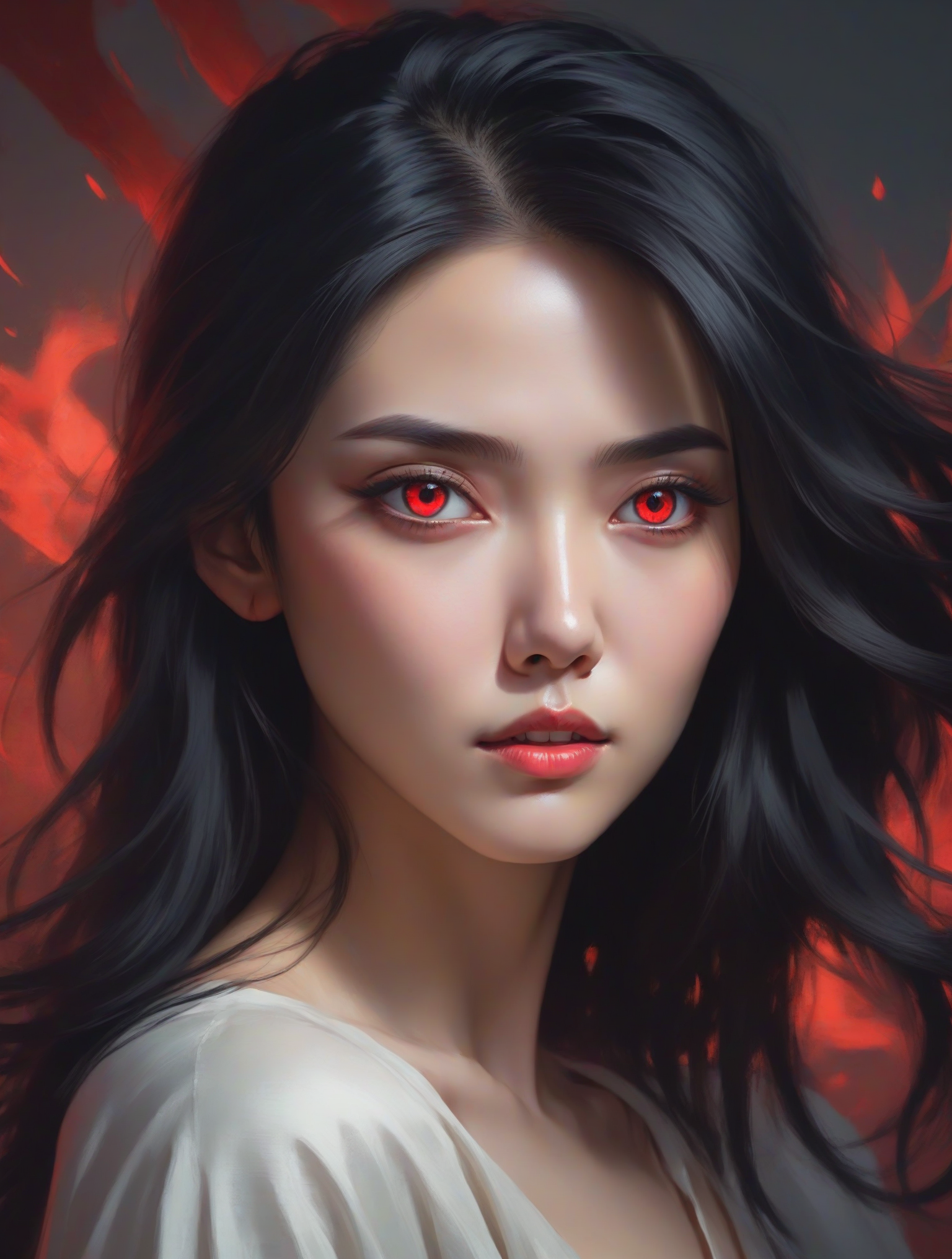 Beautiful woman, black hair, red eyes, very attractive portrait, in the style of dans cieland and Fenghua Zhong and Huang Guangjian, portrait, in the style of bicolor art, fantasy portrait by Ross Tran, concept art, trending<lora:Yuffin:1.0><lora:Yuffin:1.0>