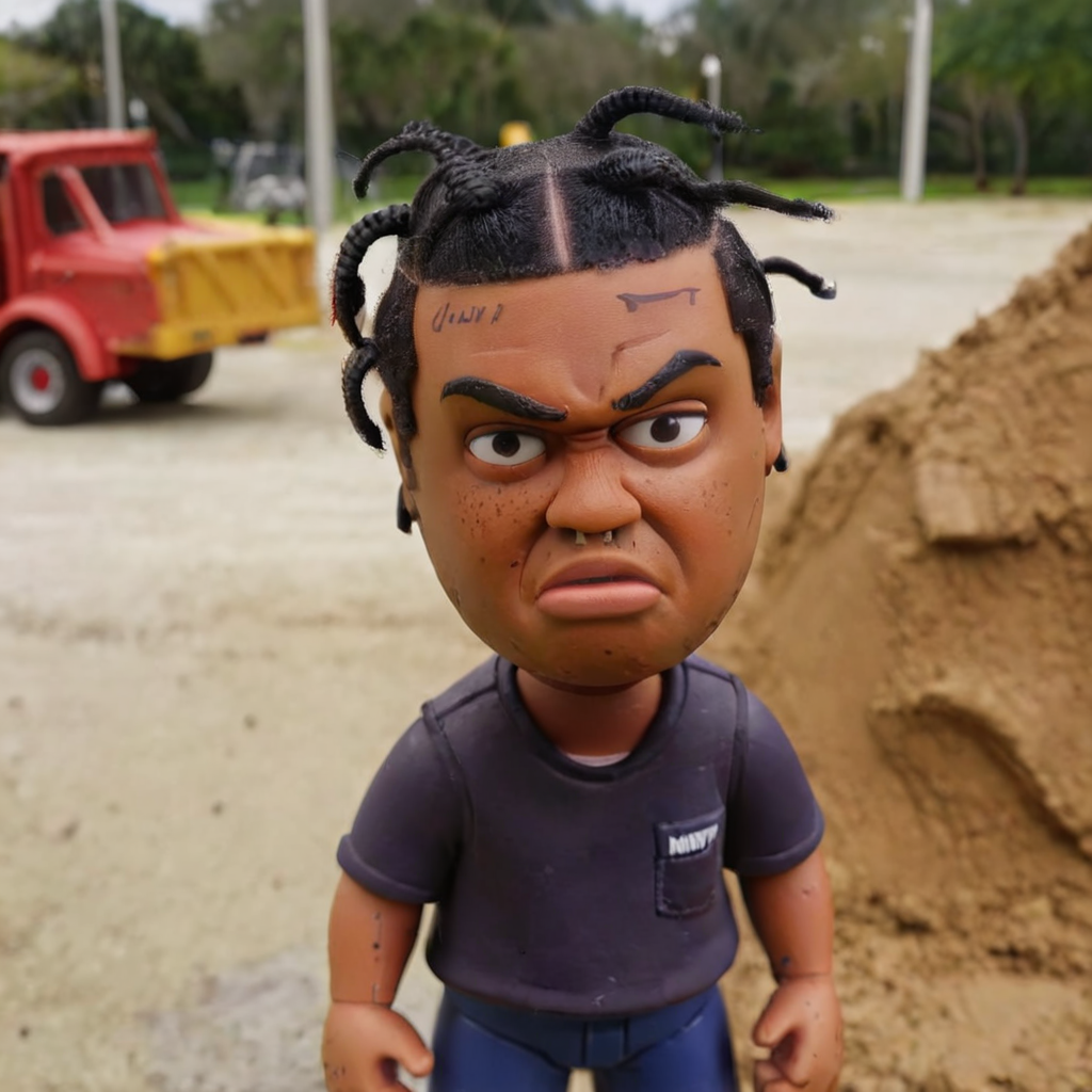 <lora:Clay Animation:1> clay, animation, claymation <lora:mkybrxl:1> mkybr, male focus, 1boy, dark-skinned male, small braids sticking out on head, photo background fat black man, with a dump truck behind him