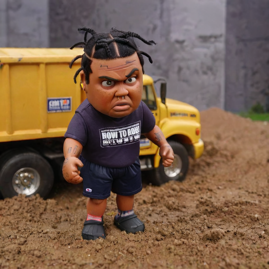 <lora:Clay Animation:1> clay, animation, claymation <lora:mkybrxl:1> mkybr, male focus, 1boy, dark-skinned male, small braids sticking out on head, photo background fat black man, with a dump truck behind him, truck has logo that says "trauma Dump"1man standing next to 1 man