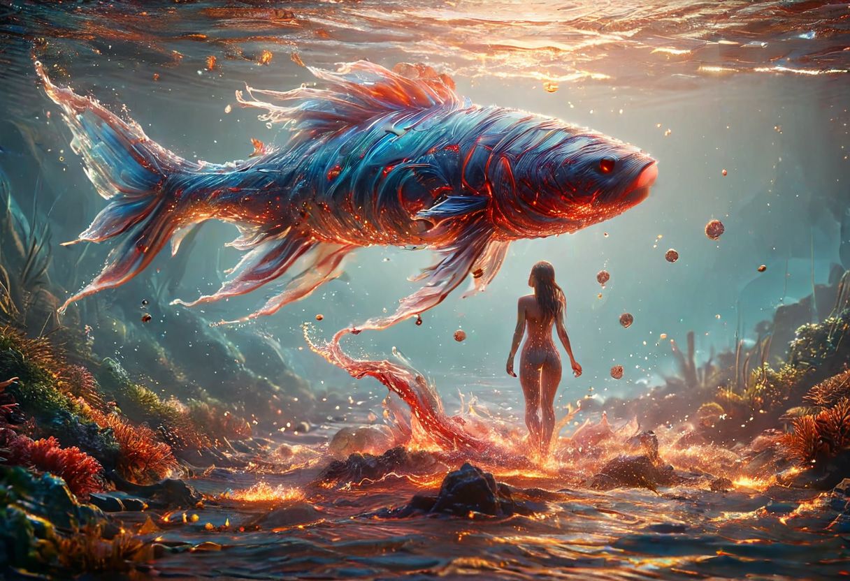 ethereal fantasy concept art. .The most beautiful girl in the world, swimming in dreamy deep water, comes face to face with a (((a very big red fish with very detailed, shine scales))). the girl's hair, is braided with ((colourful algae)). around them there are many colourful coral reefs and fish. the water shimmers, with sunlight. full body, low angle shot. 8k, masterpiece magnificent, celestial, ethereal, painterly, epic, majestic, magical, fantasy art, cover art, dreamy