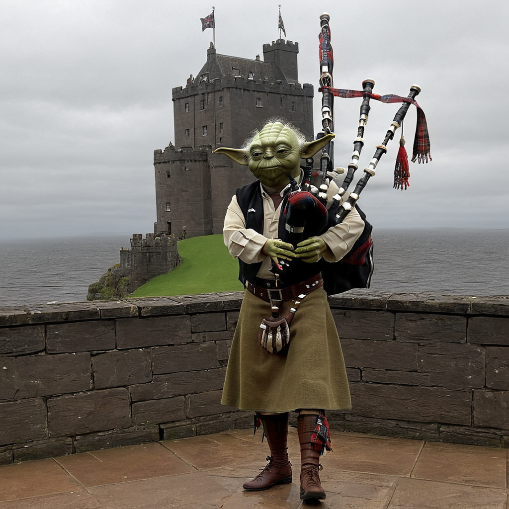 (Yoda playing bgpps) standing on the battlements of a scottish highland castle, bgpps, bagpipes, castle, highlands, rain, High quality 3D rendering, fantasy, Pixar 3D character design style, ZBrush high-polygon modeling,