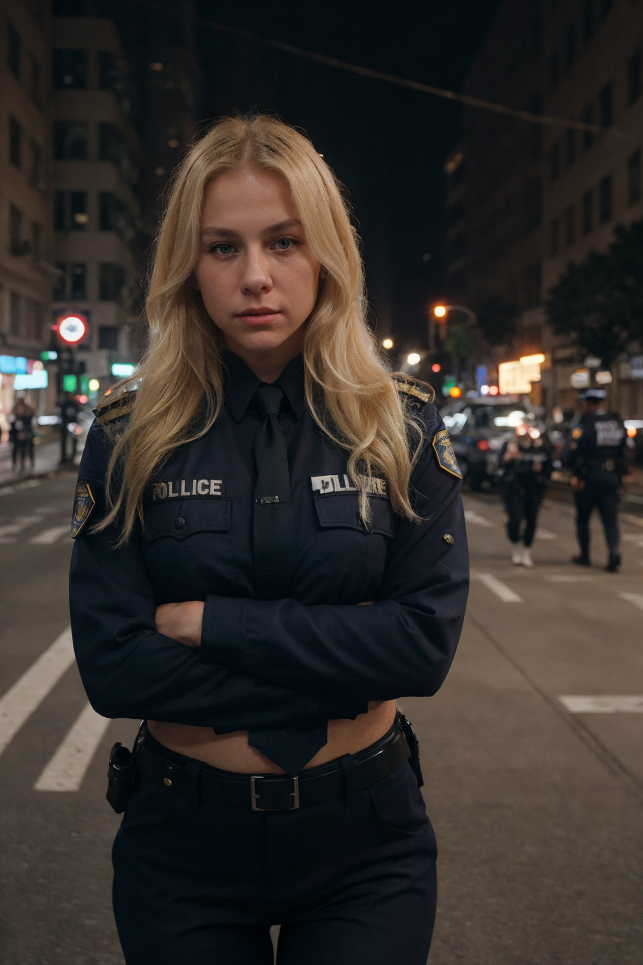 blond female police officer uniform in new york streets <lora:epiCRealLife:1>