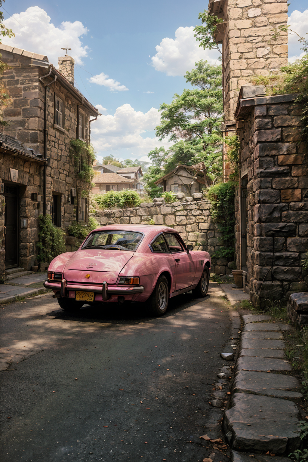 a pink car parked in front of a stone wall ,VisionaryVerse , <lora:VisionaryVerse-SD15:0.75>
