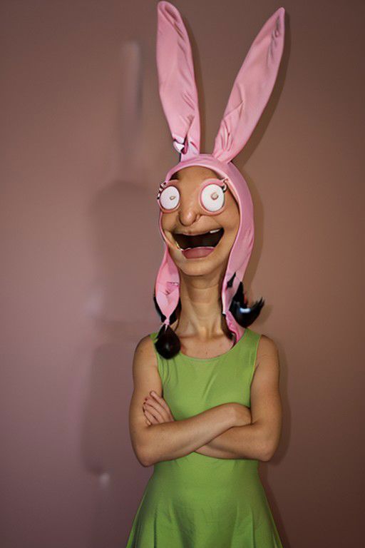 louiseb, bunny hat, 1girl, green dress, solo, black hair, smile, black footwear, short sleeves,looking at viewer, smile,black eyes,looking to the side,crossed arms, <lora:louiseB2.0-000009:0.6>