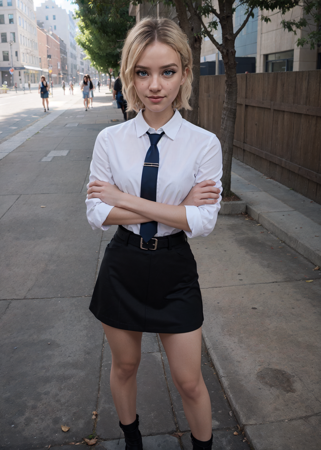 (full body shot), BREAK <lora:sgwen, blue eyes, short hair, blonde hair:0.6> sgwen, blue eyes, eyeshadow, lipstick, 1girl, solo, short hair, shaved side, blonde hair, female focus, smile, standing, hands at sides, dress shirt, (blue tie), \(black\) skirt, belt, heels, <lora:epiCRealismHelper:0.4> <lora:detail_slider_v4:1> BREAK sidewalk, park,
