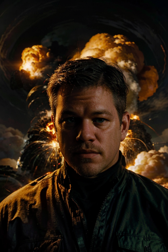 a portrait photo of 1man surrounded by orange explode,Matt Damon,nuclear explosion,<lora:Oppenheimer>,