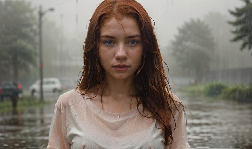 portrait of a beautiful young redhead woman standing in the pouring rain, wet hair, wet t-shirt, hyperrealism, photography <lora:epiCRealismHelper:1>