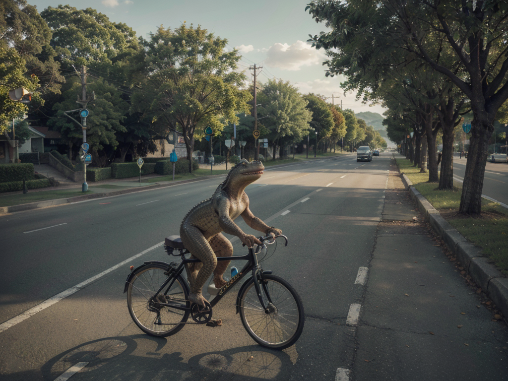 Crocodile rides a bicycle on the road, (masterpiece:1.2), best quality, high resolution, unity 8k wallpaper, photorealistic, realistic,