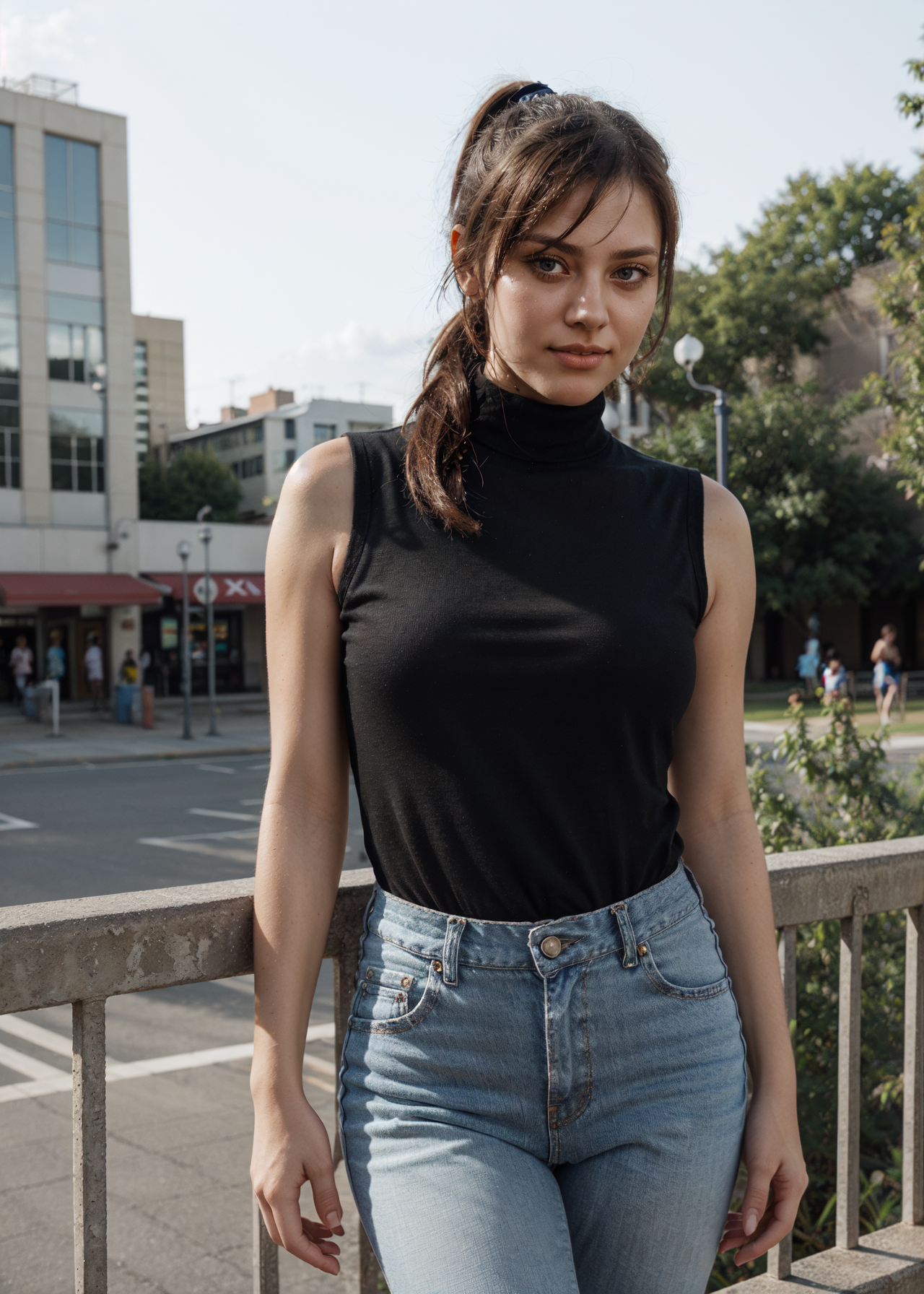 (medium-full shot, RAW, 85mm) BREAK <lyco:deborahann, sks woman:0.5> sks woman, 1girl, 30 years old, female focus, smiling, closed mouth, looking at viewer, short hair, (black hair:1.2), (ponytail, bangs), turtleneck, sleeveless, jeans, <lora:weight_slider_v2:0.2> <lora:epiCRealismHelper:0.5> BREAK outdoors