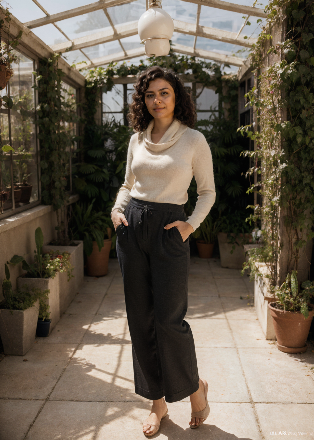 <lora:epi_noiseoffset2, dark studio, rim lighting, two tone lighting:0.3> (full-body shot, rim lighting), shot on ARRI ALEXA 65, <lora:al1ash4w:0.7> al1ash4w, solo, curly hair, black hair, female focus, Mischievous:1.2, looking at viewer, standing, hand in pocket, Cowl neck sweater, Gaucho pants <lora:ReaLora:0.45> <lora:epiCRealismHelper:0.4> <lora:detail_slider_v4:0.5> In the conservatory