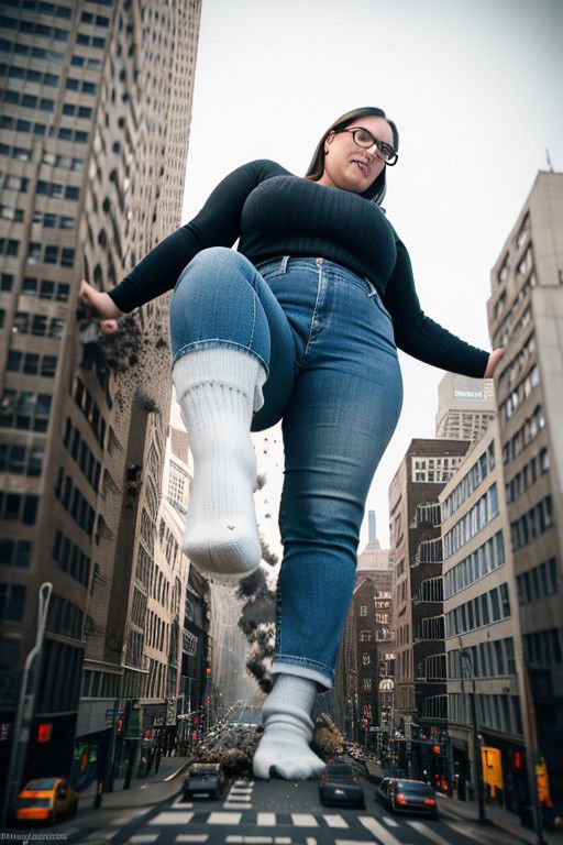 Birds eye, 100,000ft tall angry Giantess woman crushing buildings with white socks, stomping foot down, running, walking, stepping on city in socks, squishing people and cars under foot, destruction, debris, giantess feet crushing people, destroying town with socked feet, Socks destroying street, giant woman placing socked foot on building, woman stomping hard into the ground, sexy, young Brunette, chubby, Thicc, wide shoulders, short, curvy, glasses, blue jeans, white socks, perfect face, symmetrical face, symmetrical glasses, perfect glasses, woman looking down at tiny city, tiny city is being destroyed, (dirty feet:1.1), (dirty socks:1.2), feet focus gloom, particle effects <lora:Really_dirty_socks_Lora_and_feet:0.7>