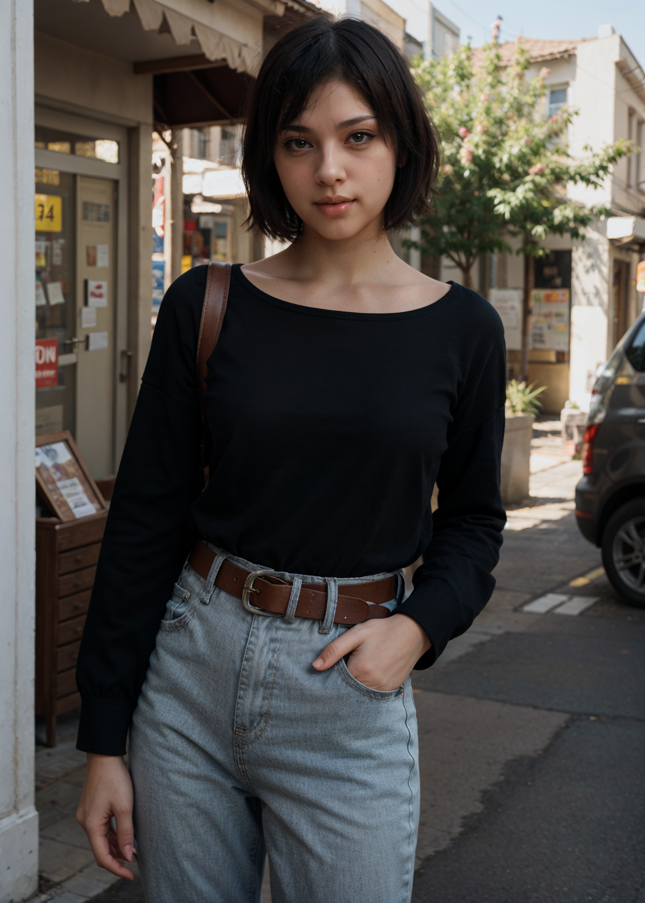 <lora:epi_noiseoffset2, dark studio, rim lighting, two tone lighting:0.3> (medium-full shot, rim lighting), BREAK <lora:no cap, s40r1h, brown eyes, bangs, long hair, black hair:0.7> s40r1h, green eyes, blunt bangs, short hair, black hair, solo, female focus, smile, looking at viewer, blouse, long sleeves, high-waisted pants, belt, standing, hand on hip, <lora:epiCRealismHelper:0.4> <lora:detail_slider_v4:0.5> BREAK street, outdoors,