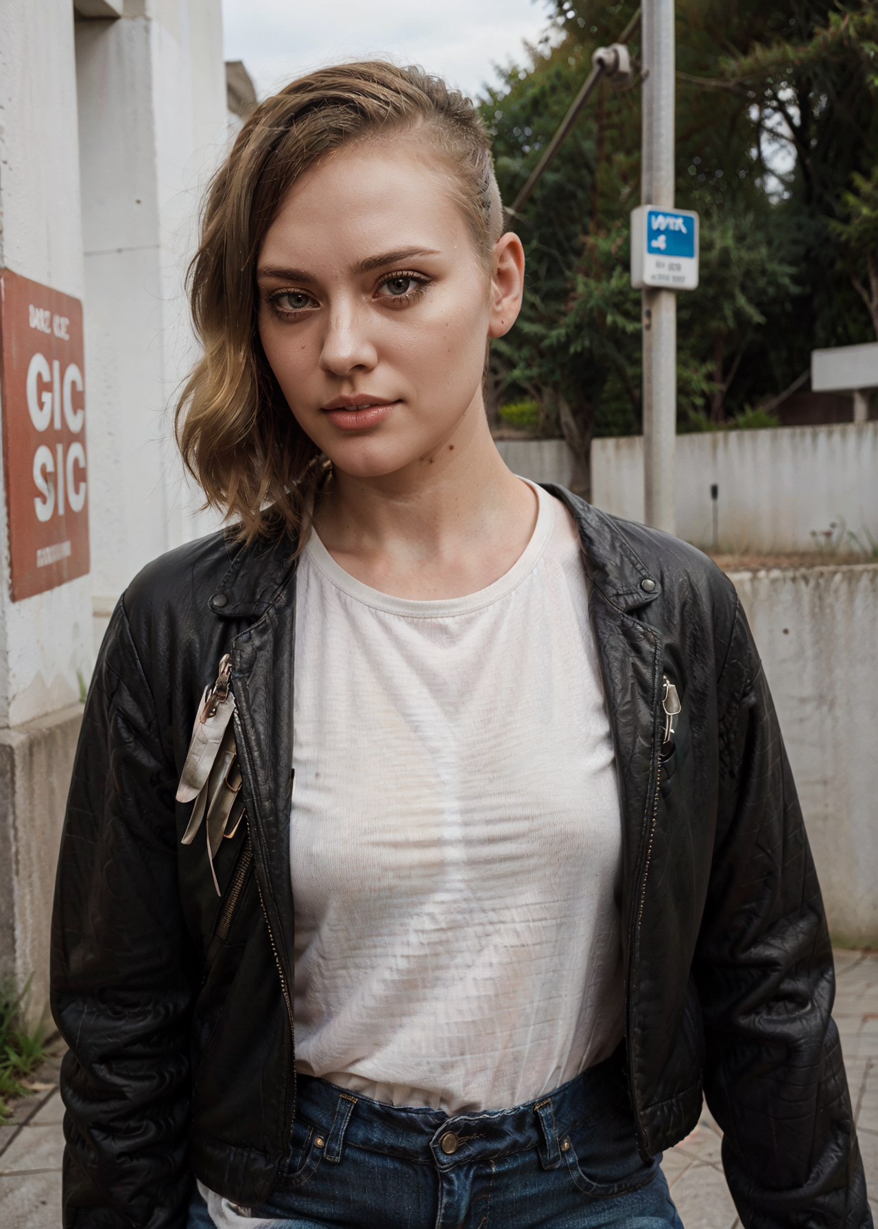 (medium-full shot, RAW, 85mm) BREAK <lyco:deborahann, sks woman:0.1> sks woman, 1girl, 30 years old, female focus, smiling, closed mouth, looking at viewer, (blonde hair:1.2), (half_buzzcut_hairstyle:1.3), leather jacket, zipped, jeans, <lora:half_buzzcut_hairstyle:0.5> <lora:weight_slider_v2:0.2> <lora:epiCRealismHelper:0.5> BREAK outdoors