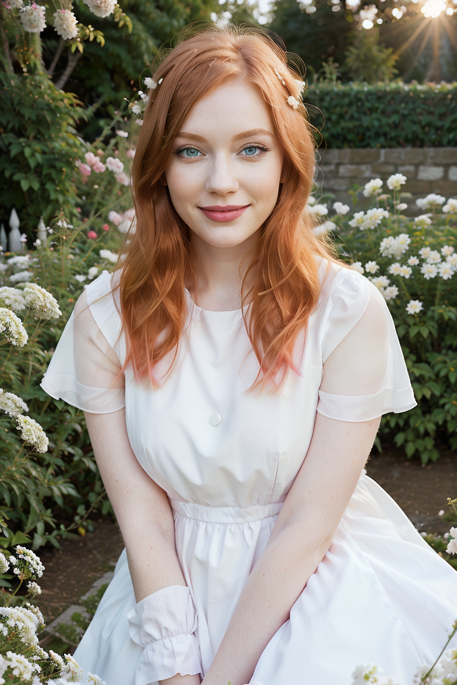 1women, ginger, blue eyes, bob hairstyle, fluffy hair, <lora:skin_tone_slider_v1:-2.5>, makeup:1.2, pink full lips, smiling, full body, portrait, looking at viewer, high detailed, sunset time, garden, (vibrant colors:1.2), summer, white flowers, white dress,