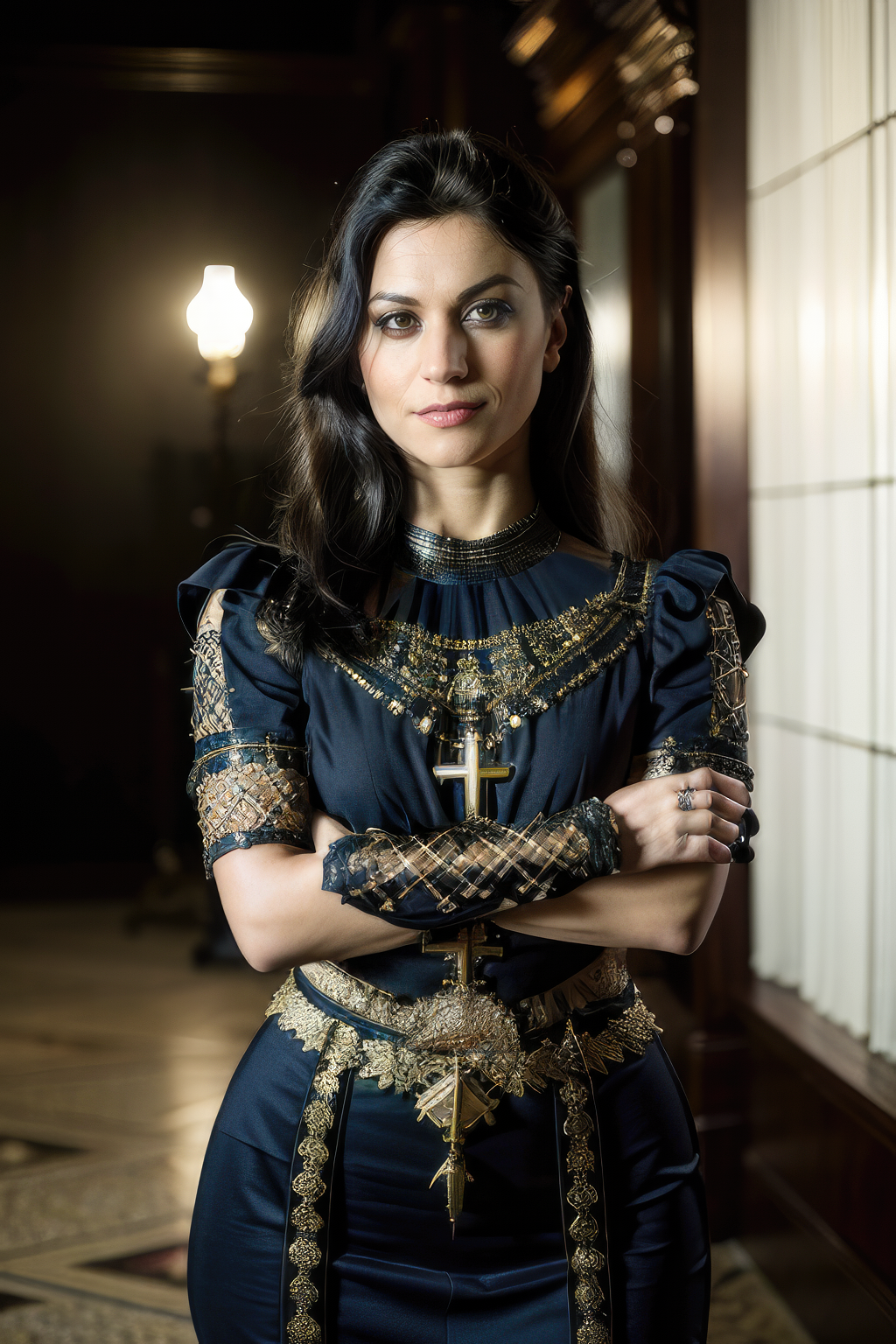 masterpiece,beautiful,extremely detailed,(ultra high res),(8k UHD best quality), (realistic, photo-realistic:1.37), depth_of,field, blurry_background, photo_inset,Dramatic lighting,reference_inset,photo_background,photorealistic,looking_at_viewer,1girl,detailed skin,(((crossed arms))),(((full body))),cristina<lora:cristina scabbia:1>